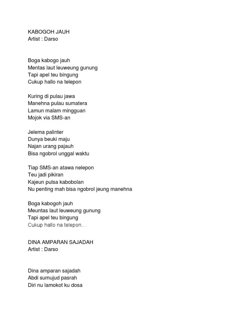 Dm e mentas laut leuweung gunung. Angin laut di tanjung baru mawa ombak nganteurkeun budah ka sisi. Dm c tapi apel teu bingung. F ngajugjug ka hiji lembur. Bb am sabab aya nu diteang. Dm c∼ tapi apel teu bingung. Dm e mentas laut leuweung gunung. Am f dm am e f e am f e am am mapai jalan satapak. Di basisir kaler kota karawang Am jelema palinter am dm dunya beuki maju g najan urang pajauh f am. Meskipun sudah mengeluarkan sejumlah singel, lagu berbahasa sunda tersebut tetap menjadi lagu terpopuler dari kunkun. Kumpulan lirik & chord lagu sunda darso · ∼am boga kabogoh jauh. Dm f tapi apel teu bingung